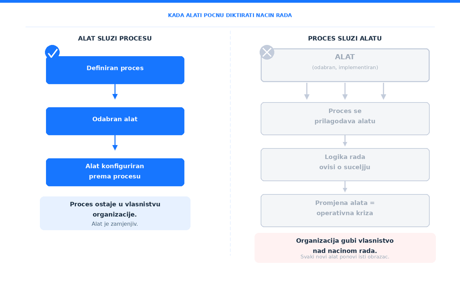 Svaka organizacija u određenom trenutku uvede alat koji treba riješiti konkretan problem. No s vremenom se nešto tiho preokrene: umjesto da alat prati proces, proces počne pratiti alat. Ovaj tekst istražuje kako do toga dolazi, zašto je to operativno opasno i kako se iz te zamke izaći.